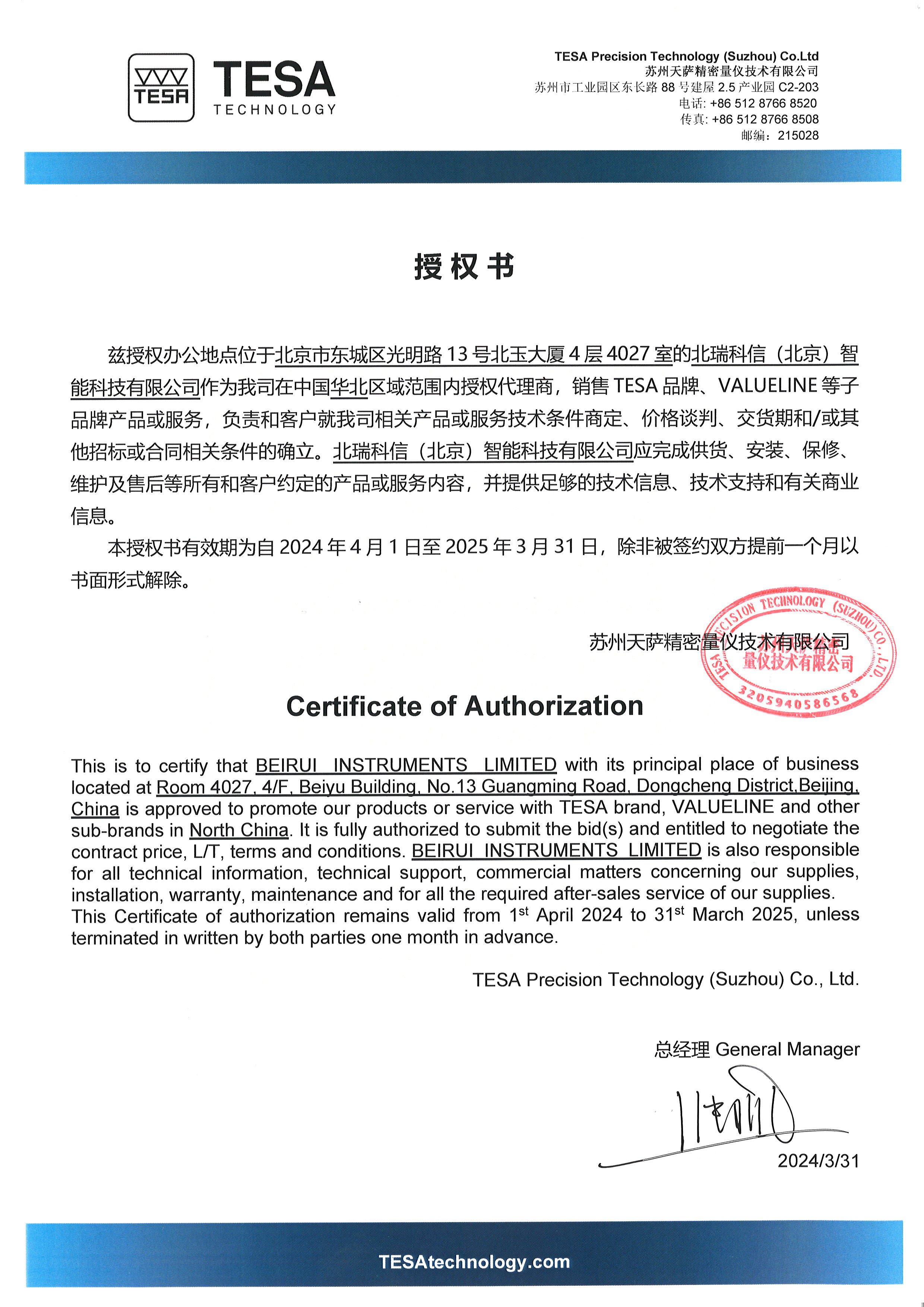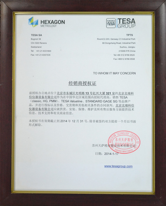 • 2014年瑞士TESA授權(quán)證書