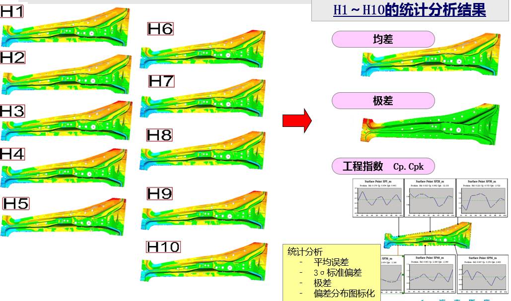 例如拉延件,修邊,沖孔,翻邊,整形等,首先各個工序件與本身工序加工數(shù)型做對比分析,查看模具與本工序零件的變形干涉情況,后一工序的加工數(shù)據(jù)對比分析查看其不同,通過兩個數(shù)據(jù)比對分析,可有有效的分析出當(dāng)工序零件在此工序時候的變形問題。所有工序零件還需要跟最終產(chǎn)品做對比分析查看其變化趨勢,分析出哪一個工序是導(dǎo)致與產(chǎn)品設(shè)計不符的直接原因。