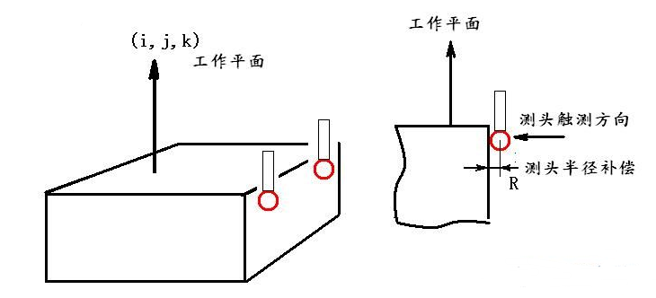 線元素是非常特殊的元素,它的測(cè)頭半徑補(bǔ)償存在一個(gè)確定補(bǔ)償方向問(wèn)題。由于我們通常只能測(cè)量二維線,所以可以借助於工作平面來(lái)確定這個(gè)補(bǔ)償方向。因此我們?cè)跍y(cè)頭線元素時(shí),一定要選擇正確的工作平面。這個(gè)工作平面要與線的矢量方向,測(cè)頭的觸測(cè)方向都垂直。用一個(gè)直白的例子,如果我們要測(cè)量桌子側(cè)面的線,一定要選擇桌子上表面為工作平面。如果這個(gè)工作平面選擇錯(cuò)了,這條線的測(cè)頭半徑的補(bǔ)償方向就錯(cuò)了,位置也就錯(cuò)了,其直線度也錯(cuò)了。請(qǐng)記住下面這幅圖。