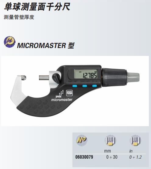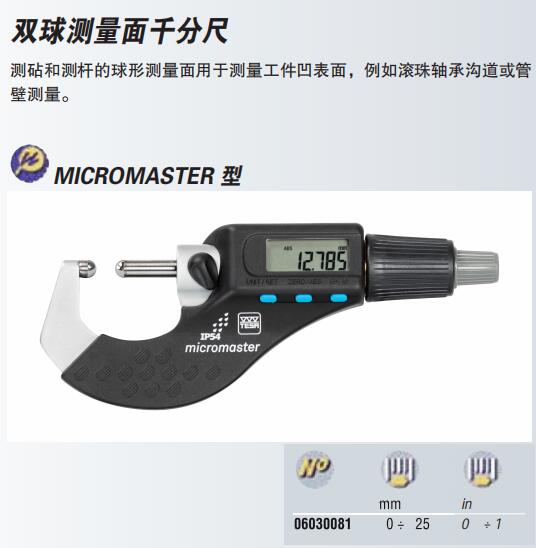雙球測量面千分尺,測砧和測桿的球型測量面用于測量工件凹表面。
