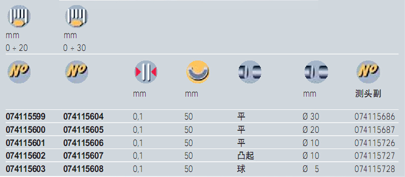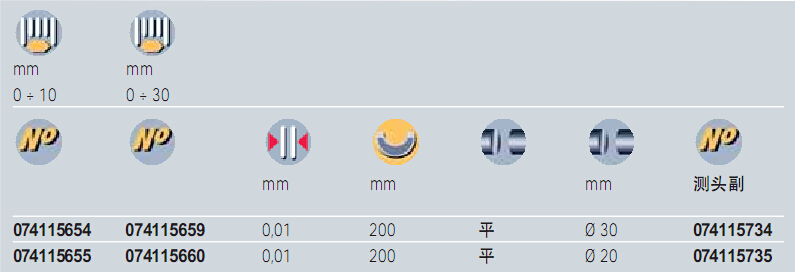 | 訂貨號(hào) | 訂貨號(hào) | 量程mm | 分度值mm | 測(cè)量面 | 測(cè)量面 直徑mm | |