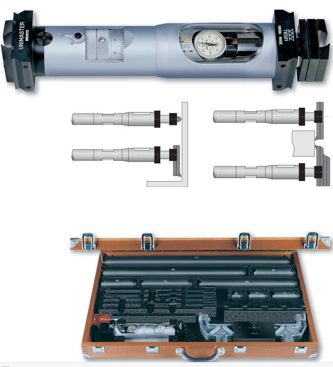 TESA UNIMASTER 與兩點(diǎn)接觸式內(nèi)徑千分尺類似的方式測(cè)量工件,本量具配備的內(nèi)置測(cè)桿只需要增加必要的加長(zhǎng)桿就可完成可擴(kuò)充應(yīng)用范圍內(nèi)任一尺寸的直接測(cè)量。