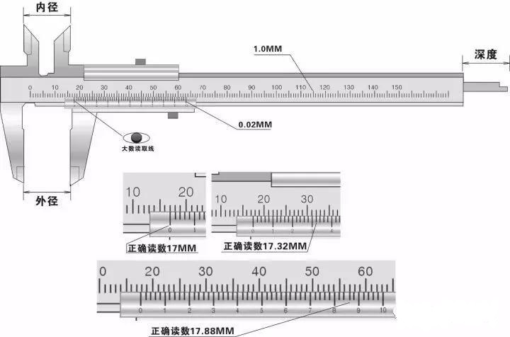 圖示,系精度為0.02mm的卡尺,其主尺上的每一小格是1mm,每一大格是10 mm;副尺上是把9 mm的長(zhǎng)度等分為10格,每小格為9/10 mm。主、副尺每格相差0.1 mm。
