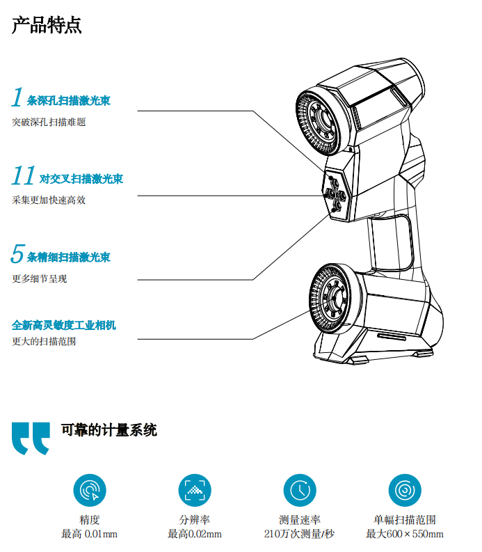 RigelScan全新升級版,在保持穩(wěn)定計量級精度的同時,掃描速率大幅提升,帶來了更加高效流暢的掃描體驗。RigelScan手持掃描三角定位技術(shù),不受物體材料、顏色等制約,另可選配攝影測量、無線模塊,實現(xiàn)大尺寸場景下的高精度檢測。