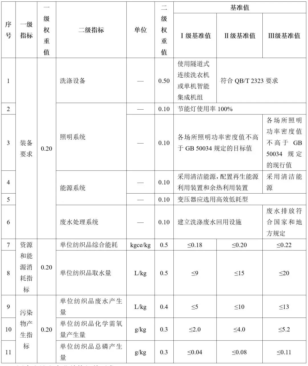 國家發(fā)改委、生態(tài)環(huán)境部、商務部于2018年12月29日頒布實施了《洗染業(yè)清潔生產評價指標體系》(國家發(fā)改委 生態(tài)環(huán)境部 商務部 公告 2018年 第85號)?!吨笜梭w系》適用于洗染企業(yè)的清潔生產審核、清潔生產潛力與機會的判斷以及清潔生產績效評定和清潔生產績效公告制度,也適用于環(huán)境影響評價、排污許可證管理、環(huán)保領跑者等環(huán)境管理制度。以公用紡織品為例,《指標體系》部分內容如下表所示。